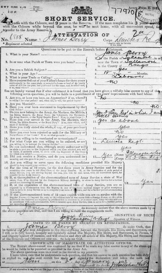 1903 Jan 2. He enlisted in Birr, claiming to be 18, when in fact he was not quite 16. He was my Grandfather . He joined up in Tullamore aged 16, his mother was enraged and eventually bought him out, so he joined up again when he was 18.