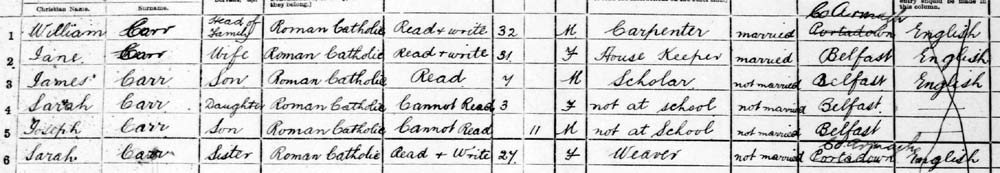 1901 census - the only family that fits is the above. They are living in Dunmore St, Falls Rd area of Belfast. In addition the roll book gives him as a carpenter. His 1916 information in Germany confirms Dunmore St. So I am confident that this is the right family