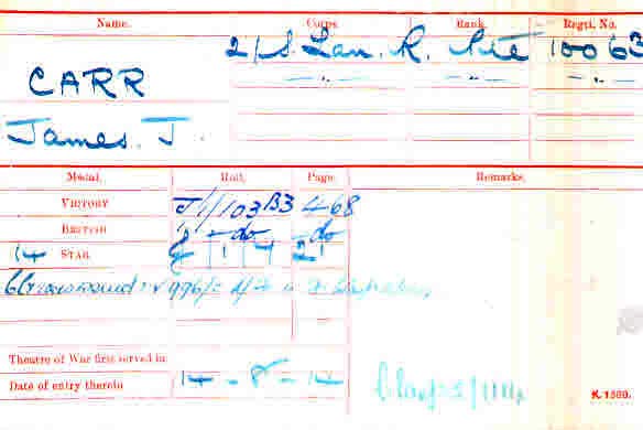 Roll of Irish Brigade in Zossen confirms the correct man and service no. He was a carpenter before enlisting and is fingered by Private F Byrne of 2nd South Lancs in a POW interview, who states that Carr a South Lancs man joined the Irish Brigade. And Keogh gives him as James Carr from Belfast. McDonagh cites him as an Orangemen from Belfast who murdered Sweeney. Mahony confirms South Lancs. This is definitely him. He did not volunteer for Egypt with the Irish Brigade. However after the war he was involved in the death of Patrick Sweeney , who was reported to have been "stabbed by Private Carr of the South Lancashire Regiment" on 21 Feb 1919 at Tutzing near Munich. Mahony also records how Carr of South Lancs murdered Sweeney over a quarrel about money. Carr was arrested, but there the tale stops, and I have no idea what happened as a result of this arrest or even who arrested him.