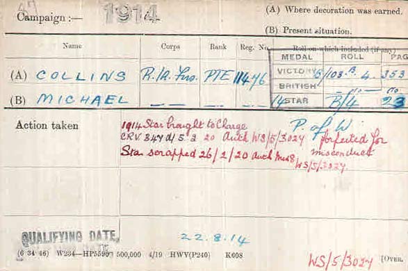 Roll of Irish Brigade in Zossen confirms service no. 11476, born Dublin. Casements list just gives "labourer" before enlistment. Further Keogh's knowledge of the man is sketchy. Mahony has him as J Collins of Royal Irish Fusiliers. He is in fact be Michael Collins of Royal Irish Fusiliers. He arrived early in France, and forfeited his medals.