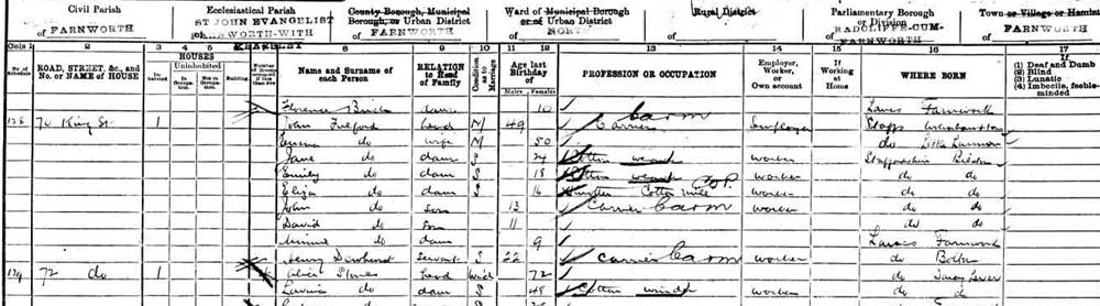 1901 There are no Fulford in 1901 Ireland census. In 1901 England census has this man as a possible. John Fulford, aged 13, living with his parents at 70 King St, Farnworth, Lancashire. Born in Bilston, Staffordshire, and parents born in Staffordshire. Bilston is a town a few miles SE of Wolverhampton in South Staffs. 1911 census follows through with the same man with John Fulford living at his wife's parents' house at 74 Brackley Street, Farnworth (the head of house is one Robert Jones, a married coal miner, aged 42 and his wife Janet). John Fulford is given as married, son in law of Robert Jones, a carter, aged 23 and born in Ladymore, Staffs. But it transpires that is not our man, his pension record exists, and he was not in S Staffs but ASC, and only went to France late in 1916.