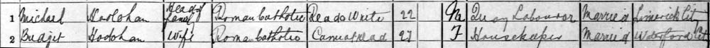 1901 census, his brother Michael is tracable as he is married, but not possible to find the single Patrick (Holihan is a name that has many varients in censuses)