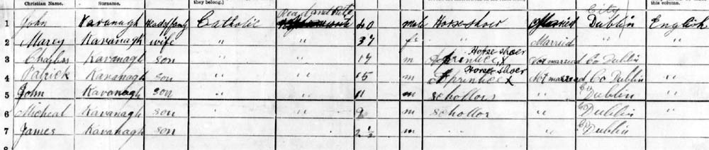 1911 Census has John Kavanagh, single, living with his parents John & Mary Kavanagh at 43 Foley St., North Dock, Dublin. He is aged 21 and a farrier, the trade given by Casement. Note two Kavanagh families living next door to each other in Foley St, Dublin.