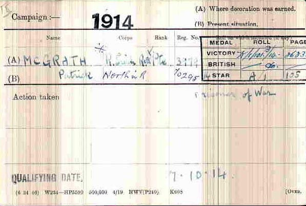 This is the right service number from Roll Book. Keogh has him from Tipperary. And Casements notes say he was a "horse trainer" before enlisting. Family records show that he was a jockey (info from Brian Curley - Pat McGrath is his wife's grandfather). He was believed to have been caught by British trying to board a ship to Canada and that they they were all beaten up badly.