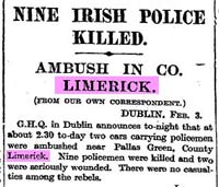 1921 Feb 3. The Ambush at Dromkeen, County Limerick took place on 3 February 1921. Dromkeen is shown on the map above. 11 policemen were killed. The RIC were returning from Caherconlish to Pallas Green when the attack began, at 2.30 pm. The first lorry was fired on, hit a wall, and left some dead. The second lorry, carrying eight Black and Tans, was near the old cemetery when it was raked with fire from Maurice Meade’s group of Volunteers in a barn on the bend and the clusters of men in and near the cemetery. All the Black and Tans 'succumbed to their wounds' said O'Hannigan in a document held at the Cathal Brugha Military Barracks. Constable Cox, and his front seat passenger District Inspector Sanson tried to negotiate the roadblocks set by the Volunteers. As the lorry crashed, the three men in the back died, but the driver and the DI managed to escape.