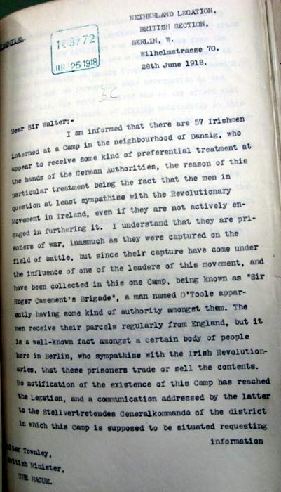 He is involved with a lot of cloak and dagger work trying to organise his coal fire scheme in Ireland. He appears to be running Rahilly and Burke independently as agents whom he want to return to Ireland as messengers. All three give propaganda talks to British POWs and all three work for Kellermann in the German Foreign Office. Both go on to do nationalist work in Ireland, but neither appear to have had anything to do with O'Toole in Ireland