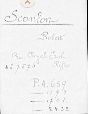 1904 Jul 27. enlisted in Royal Irish Rifles (Bailey with a service number 7483 enlisted April 1904, and Scanlon's number was 7576). This is on his birthday, assuming the birthday he gave in Germany was correct.